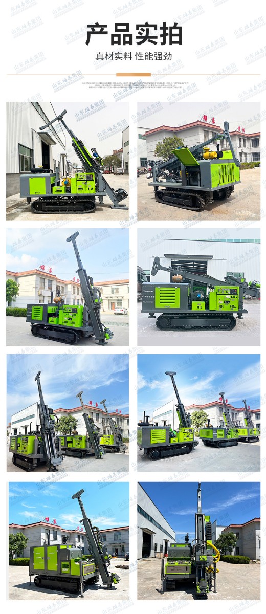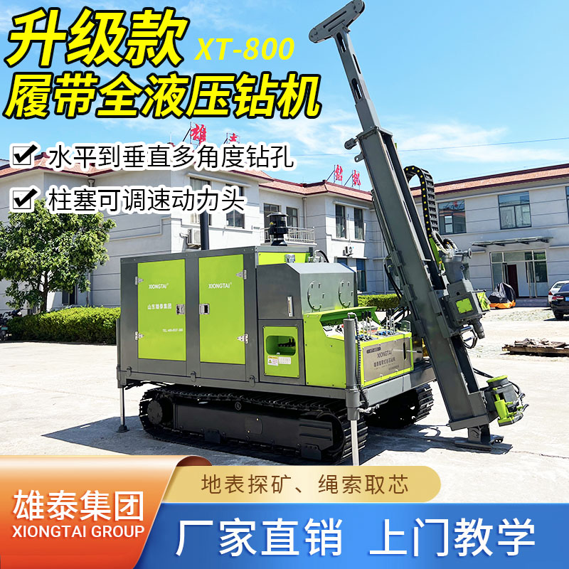 山東雄泰集團自主研發(fā)生產(chǎn)的履帶式全液壓鉆機的無線遙控行走、液壓桅桿自動升起,動力頭自動左側移機提鉆為該款鉆機一大特色。其中桅桿自動升起,動力頭移機為我公司實用新型專利,極大緩解了現(xiàn)場施工的難度,有效減小了鉆機施工人數(shù),節(jié)約了成本,該履帶式全液壓鉆機分別采用76KW/115KW發(fā)動機,動力強勁,扭矩大,適用于各類復雜地層的金屬礦開采。